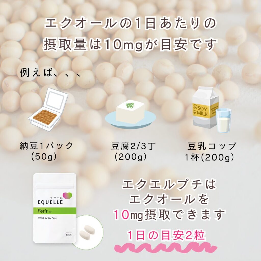 エクエルプチは、大豆由来の成分 「エクオール」 を手軽に補えるサプリメントです。